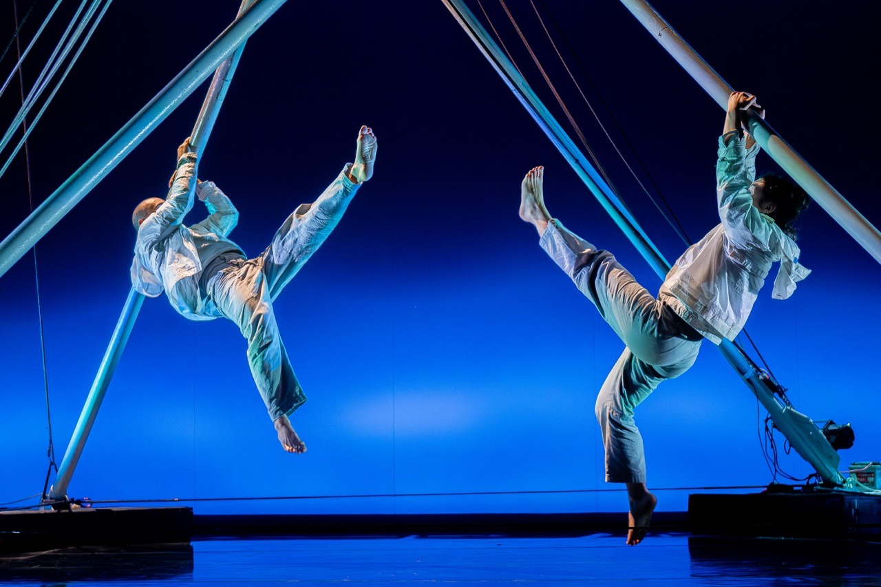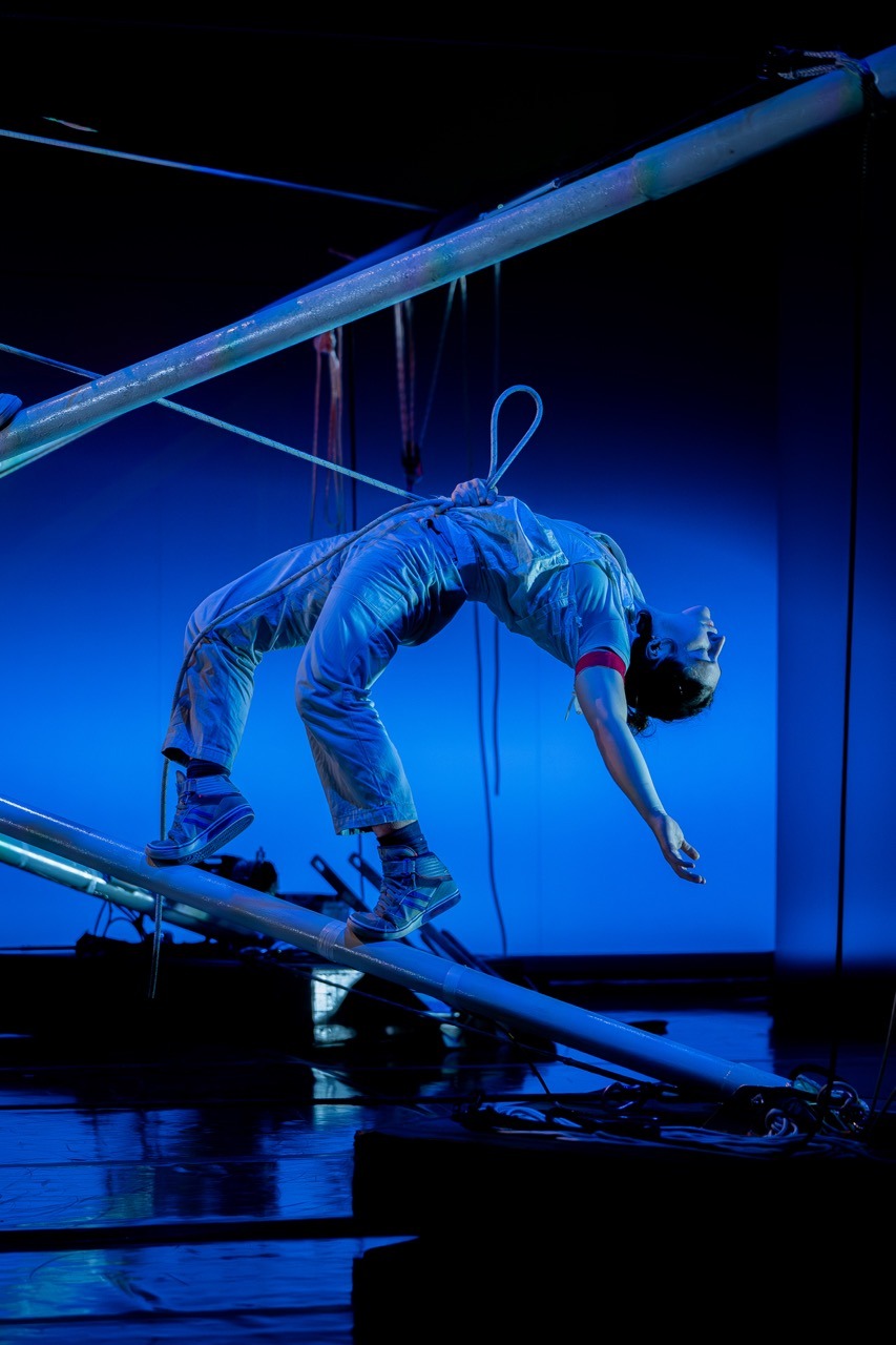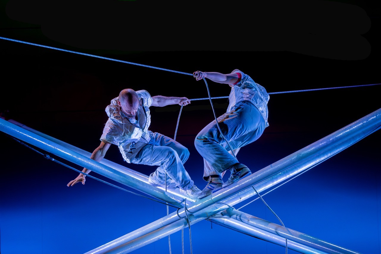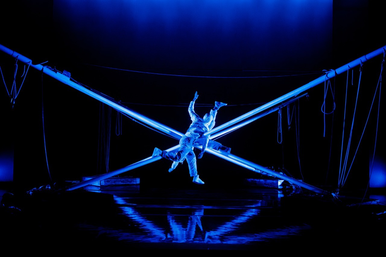 Tensegrity is an architectural concept that utilizes tensioned cables to maintain a structure in position, creating a delicate balance and a visually striking tension. This construction choice has been made so that the structure is sturdy enough to support the acrobatics and movements of the artists, while also being airy enough to give the impression of floating in the air. This structure allows for the creation of a unique space and, in addition to being an intriguing tool for exploring the possibilities of a danced vocabulary, it is also a perfect catalyst for the audience’s imagination.