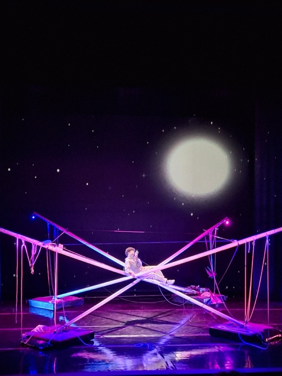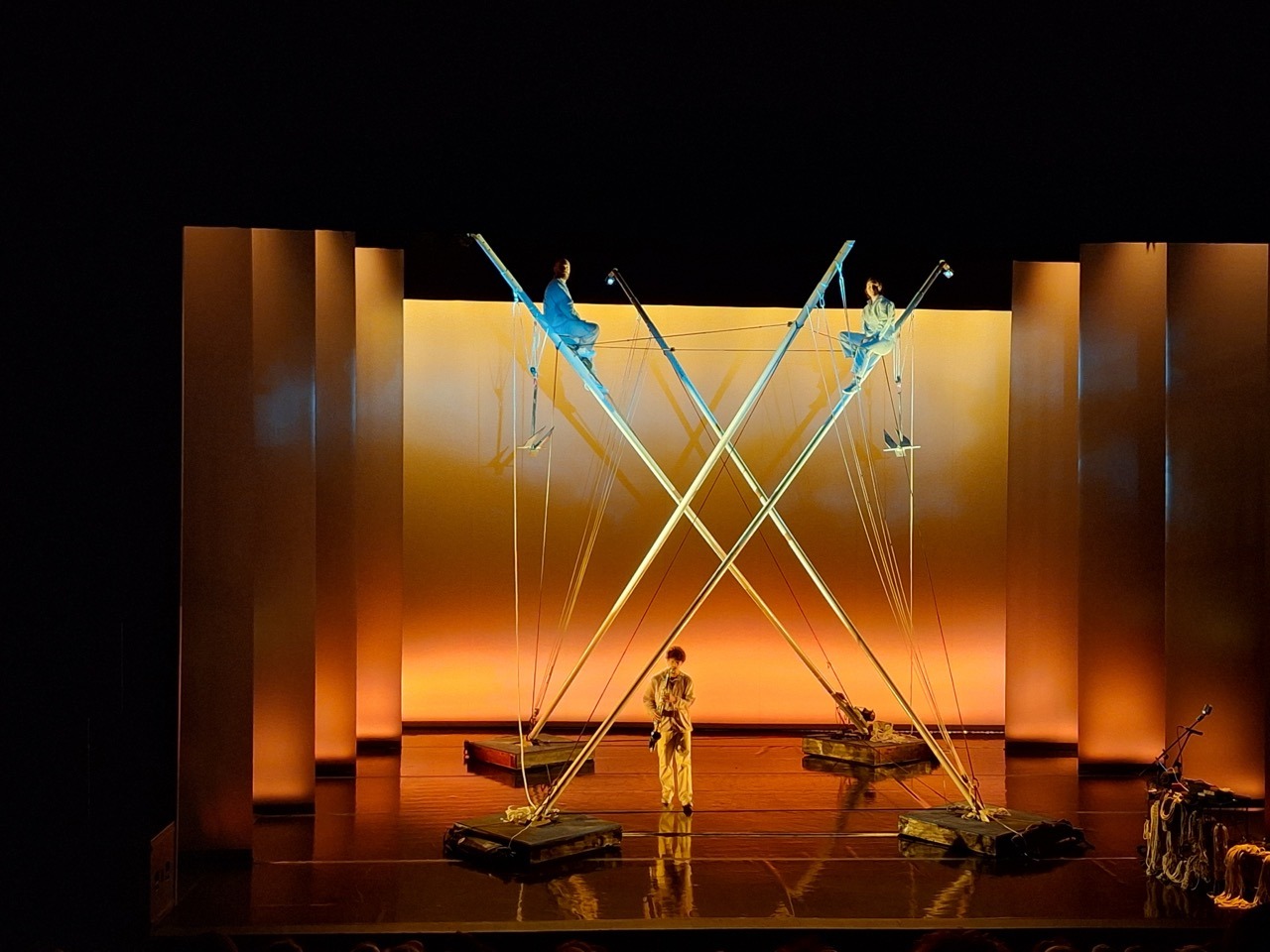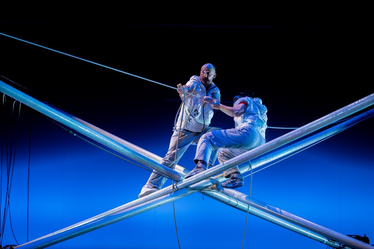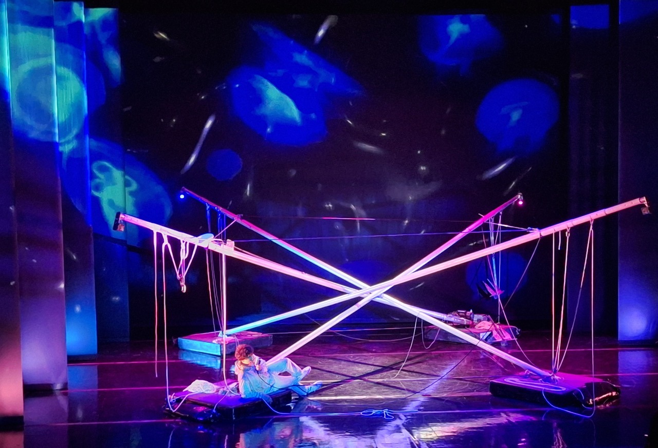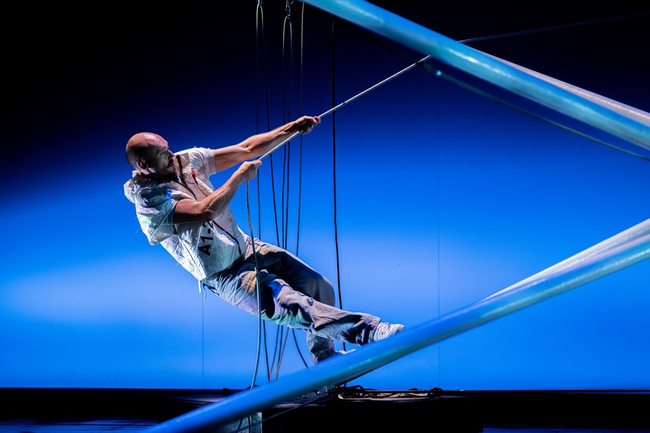 Tensegrity is an architectural concept that utilizes tensioned cables to maintain a structure in position, creating a delicate balance and a visually striking tension. This construction choice has been made so that the structure is sturdy enough to support the acrobatics and movements of the artists, while also being airy enough to give the impression of floating in the air. This structure allows for the creation of a unique space and, in addition to being an intriguing tool for exploring the possibilities of a danced vocabulary, it is also a perfect catalyst for the audience’s imagination.