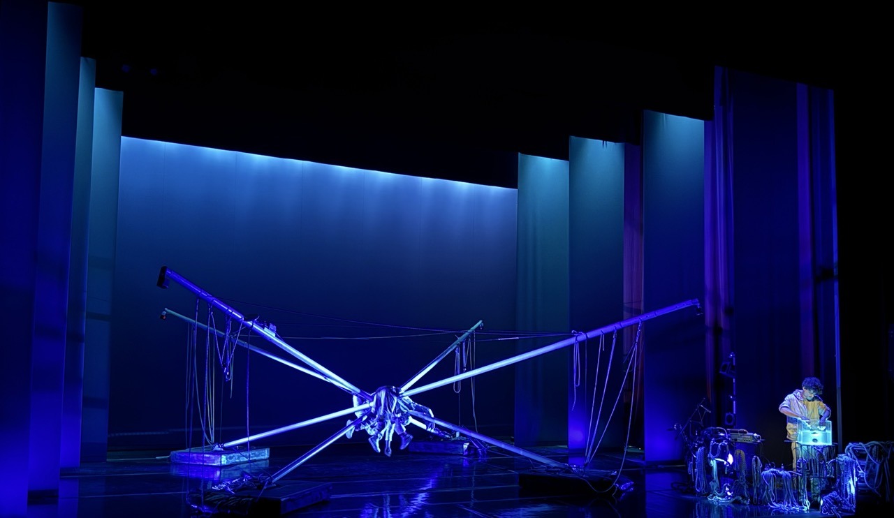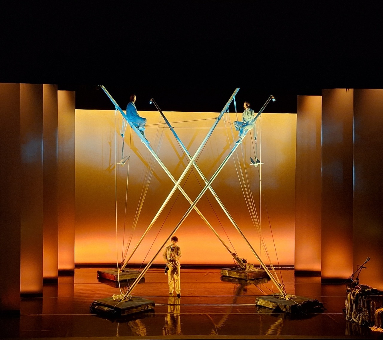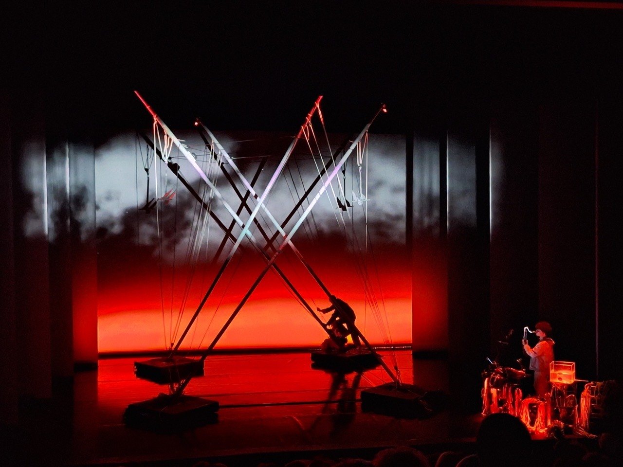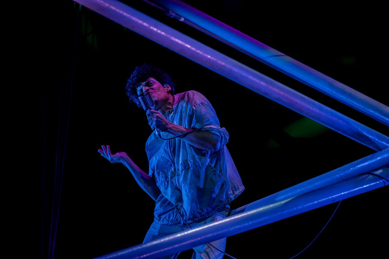 Tensegrity is an architectural concept that utilizes tensioned cables to maintain a structure in position, creating a delicate balance and a visually striking tension. This construction choice has been made so that the structure is sturdy enough to support the acrobatics and movements of the artists, while also being airy enough to give the impression of floating in the air. This structure allows for the creation of a unique space and, in addition to being an intriguing tool for exploring the possibilities of a danced vocabulary, it is also a perfect catalyst for the audience’s imagination.