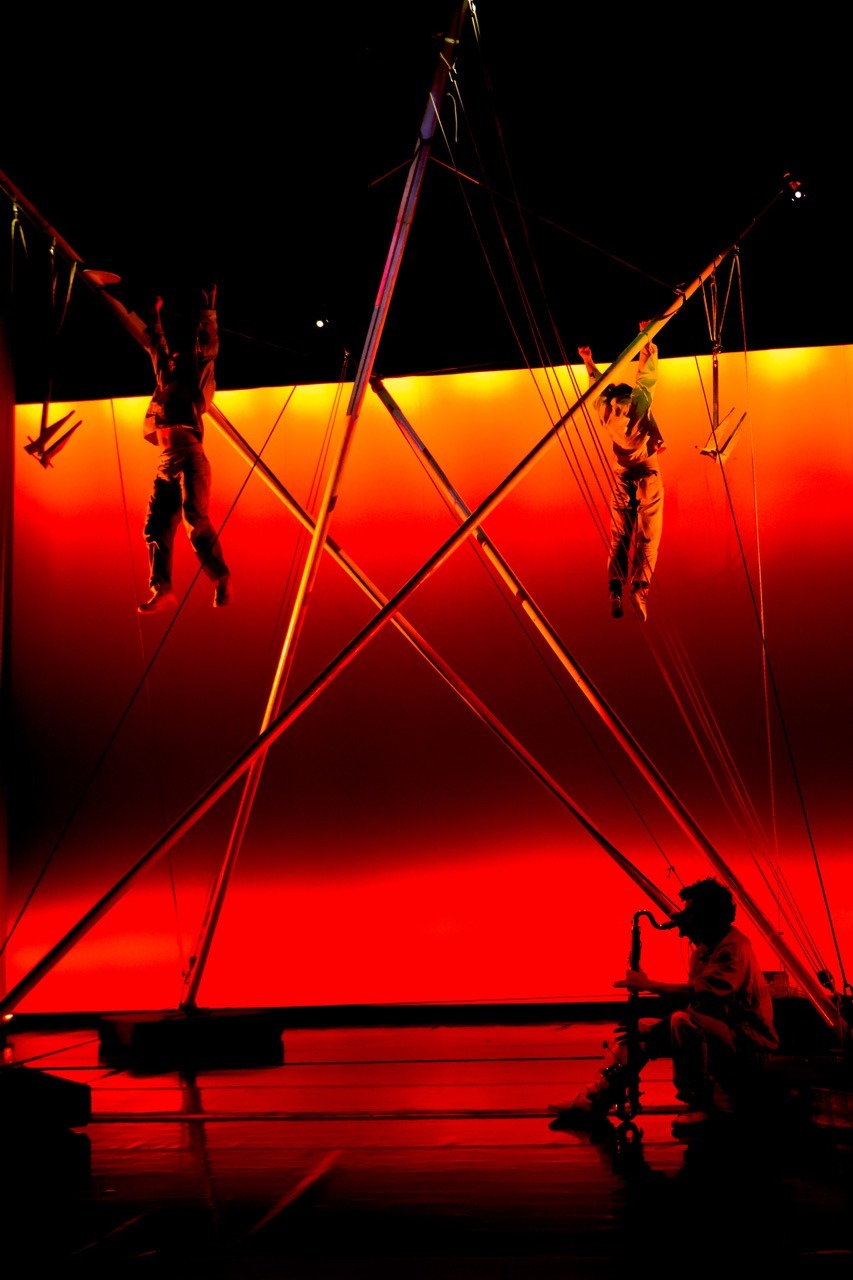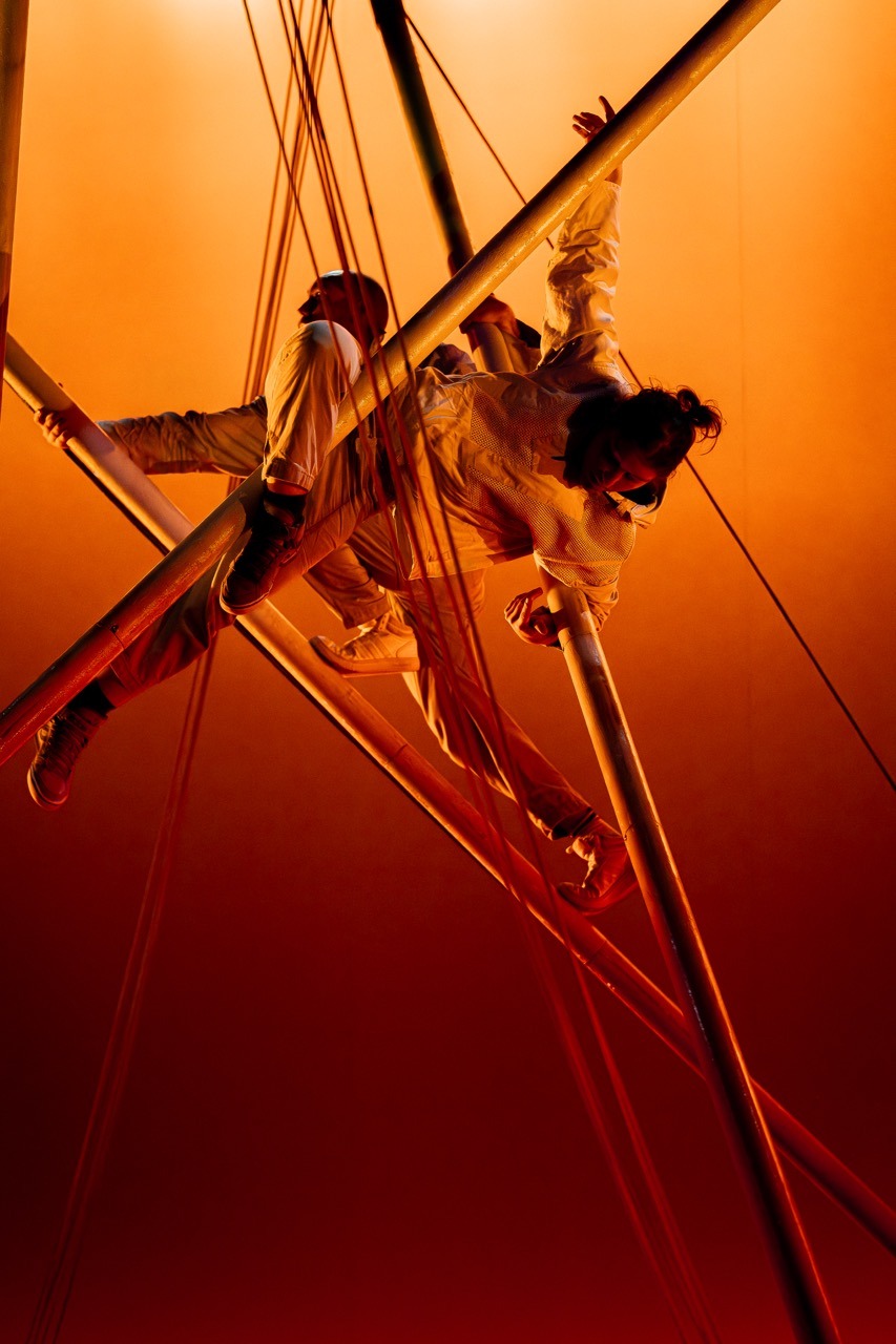 Accompanied by spoken and sung texts, two acrobats/dancers move on a self-supporting sculpture, evoking the physicality and extreme conditions of sailing on a sailboat. Their bodies tell us an upside-down shipwreck story. From the image of a boat at the bottom of the ocean to the moment of departure with all the joys and excitement of the journey.